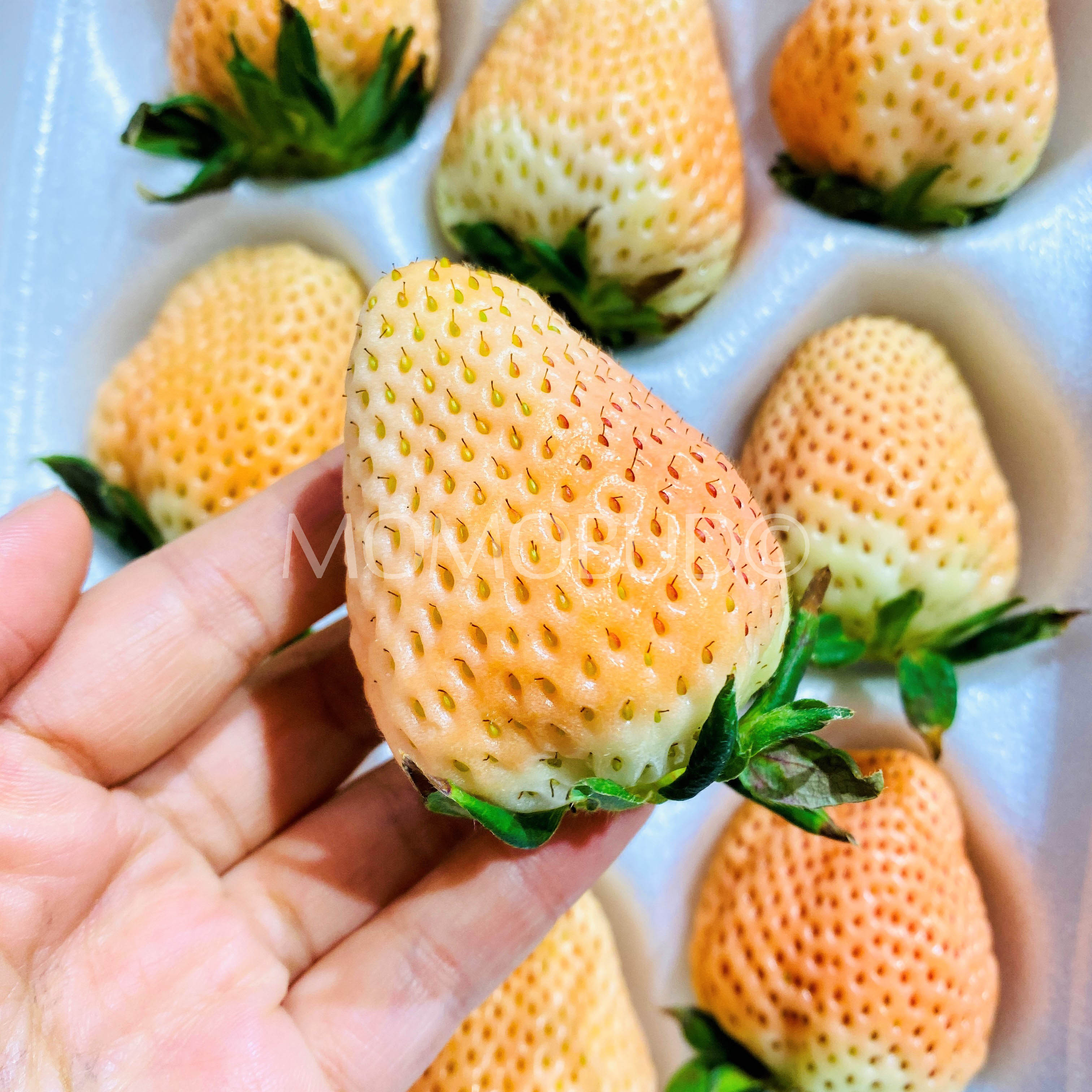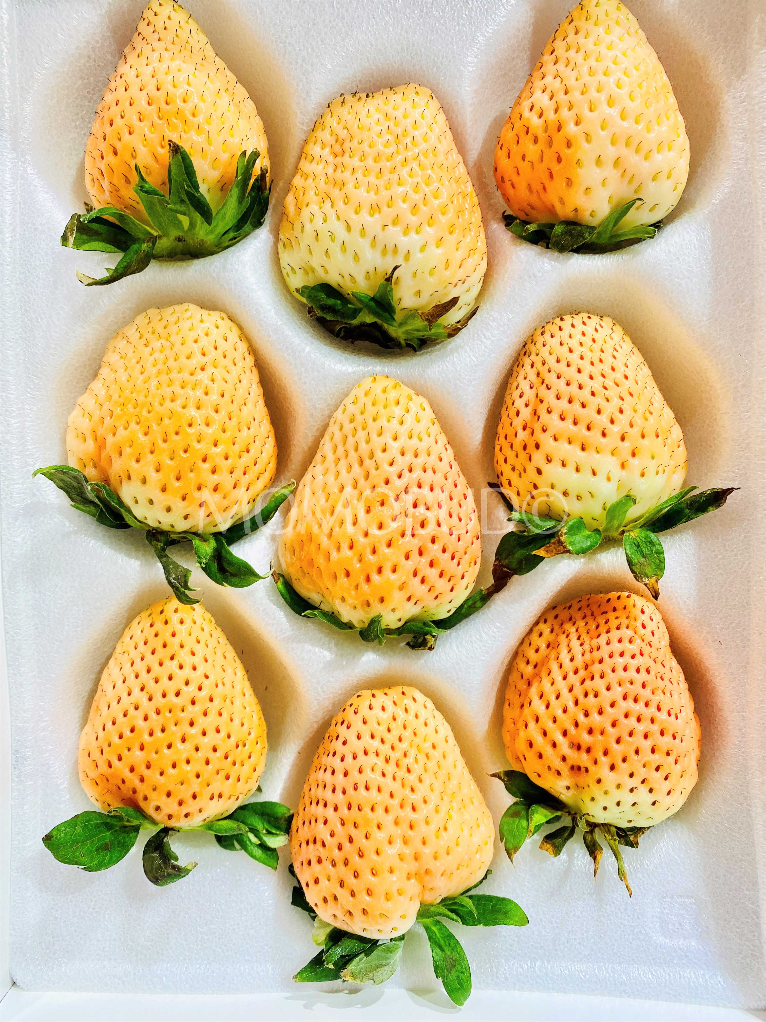 A rare strawberry variety with cherry blossom-like pink color reminiscent of a white peach, only available from Saga prefecture. Its low level of Anthocyanin (chemical which gives fruits their colors) due to sunlight restriction during maturing produces a light pinkish tone. It’s light yet smooth juicy texture gives an excellent balance with its strong fragrance and sweetness.