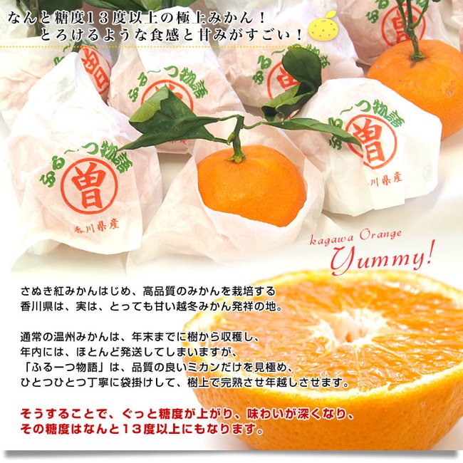 Facing the Seto Inland Sea (瀬戸内海) and blessed with long daylight hours and little rain, mandarin oranges have been cultivated for over 100 years in Soho district of Nio, Mitoyo City. Among them, over-winter ripe oranges are the best-selected high-quality oranges that are usually harvested after being ripened on the tree for about two months by hanging one bag at a time.