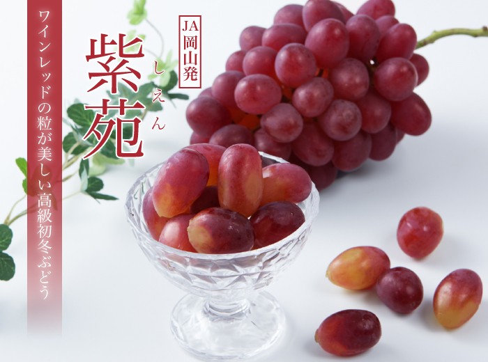 “Shien” is a red grape that was born from the combination of “Red Sanshaku” and “Akamine”. It has a color similar to that of Burgundy red wine and is vertically long and large in shape.